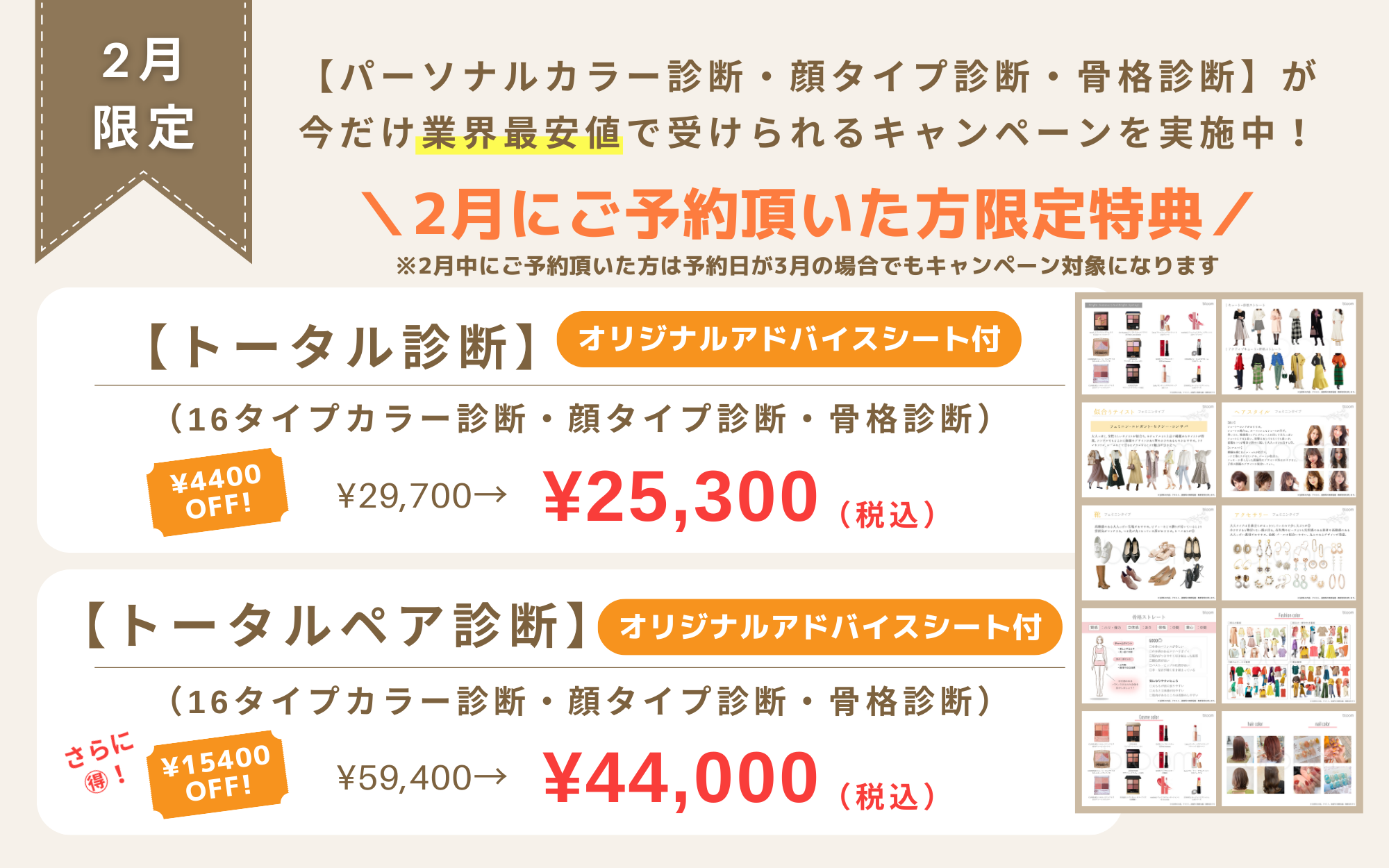 16タイプカラー診断・顔タイプ診断・骨格診断のうちお好きな診断を2つ選べるメニュー!